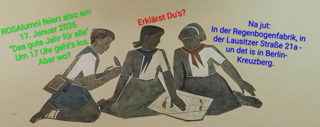 Alle Ehemaligen Stipendiat*innen der RLS laden wir herzlich zu unserem Neujahrsempfang „Das gute Jahr für alle“ am Samstag dem 17.1.2026 ab 17 Uhr in der Regenbogenfabrik in der Lausitzer Straße 21a in 10999 Berlin ein. Es gibt leckeres Essen, Musik und genug Raum sich kennenzulernen und auszutauschen. Wir freuen uns über Anmeldungen via kontakt (-at-) rosalumni.net!